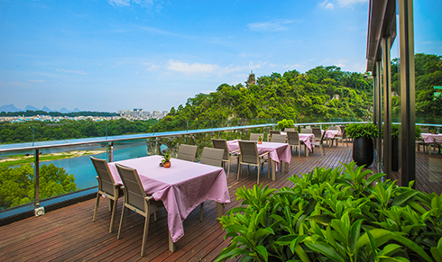The restaurant’s design introduces a concept of “lights of fishing boats on Lijiang River”. The French window achieves a limitless extension of the indoor space. With the wonderful landscapes of Elephant Trunk Hill and the river outside the window, the restaurant and the landscapes are blended as a whole. On the open viewing platform outdoors, you can enjoy a zero-distance panorama of Elephant Trunk Hill.