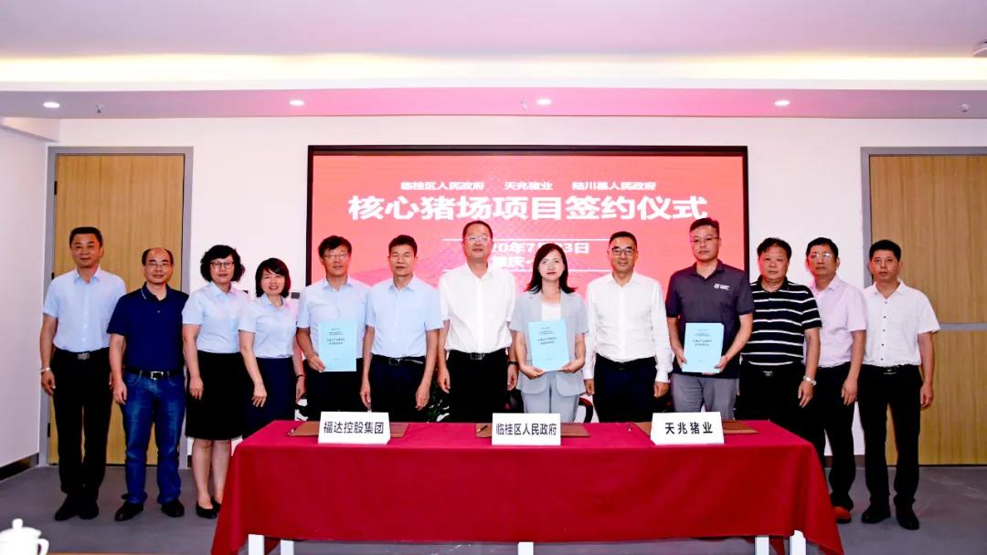 继6月30日桂林生猪全产业链项目签约、7月20日玉林国际香料中心暨福达农产品冷链物流园成功开工奠基之后,福达集团抓住契机布局农产品冷链上游产业,向“规模养殖、集中屠宰、冷链运输、冰鲜上市”方向发展。7月22日,福达控股集团、临桂区人民政府以及陆川县党政相关领导一行,共同参观了位于重庆的天兆猪业总部,考察了现代种猪产业模式,并于重庆举行了签约仪式。